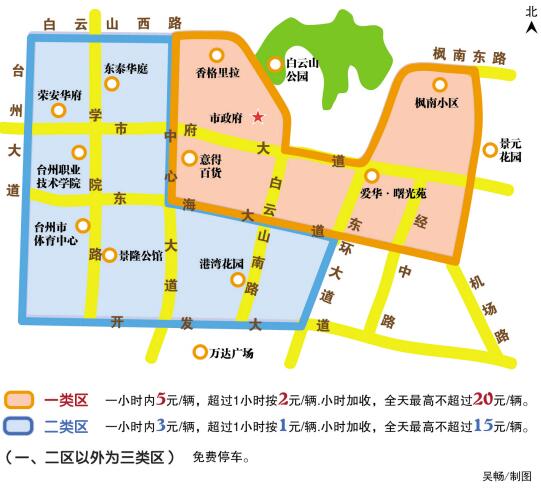 ——二類區(qū)域停車收費范圍:東至中心大道(白云山西路-東海大道)、東海大道(中心大道-東環(huán)大道)、東環(huán)大道(東海大道-開發(fā)大道),南至開發(fā)大道(東環(huán)大道-臺州大道),西至臺州大道(開發(fā)大道-白云山西路),北至白云山西路(臺州大道-中心大道);包括邊界線但不包括一類邊界線。